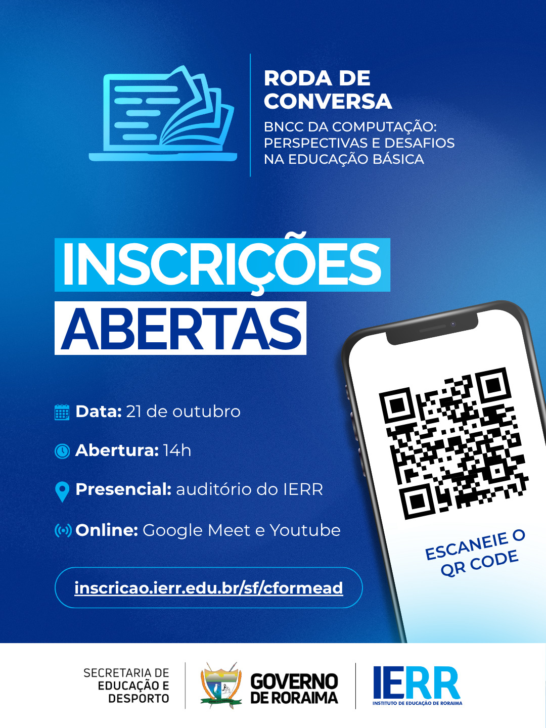 O Governo do Estado de Roraima, por meio do Instituto de Educação de Roraima (IERR), em parceria com a Secretaria de Estado da Educação e Desporto (SEED), promoverá no dia 21 de outubro de 2025, a Roda de Conversa: “BNCC da Computação: Perspectivas e Desafios na Educação Básica”.